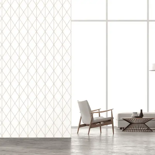 This wallpaper features a stylish geometric grid pattern with rose gold accents, offering a modern, sophisticated aesthetic. The combination of the light background and metallic grid creates a bright yet elegant atmosphere, perfect for contemporary spaces. Ideal for living rooms, bedrooms, or office areas, it adds a touch of luxury without overwhelming the decor.
