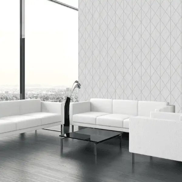 This wallpaper features an elegant diamond grid pattern, combining subtle texture and a clean aesthetic. The soft white and light grey tones lend a minimalist charm to any modern setting. Ideal for contemporary living rooms or offices, it provides a sophisticated backdrop that enhances the space without overwhelming the decor.